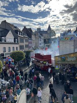 MAYEN/EB. Was das Oktoberfest für München bedeutet, bedeutet seit Jahrhunderten für die Menschen in unserer Region das Kulturgut Lukasmarkt. Eine erste Bilanz: teils lange Schlagen an Fahrgeschäften und Imbiss- und Getränkebuden und ein strahlendes bunt gemischtes, teils vor Vergnügen jauchzendes Publikum - so lässt sich das beliebte innerstädtische Volksfest am Samstag und Sonntag in kurzen Worten zusammenfassen. Also endlich wieder Zuckerwatte, gebrannte Mandeln, knallrote Paradiesäpfel, knuspriger Backfisch, ‚Hau den Lukas’ für Groß und Klein sowie Fahrgeschäfte mit und ohne Nervenkitzel - kurzum alles, was das Herz eines echten Lukasmarktbesuchers begehrt. All das und natürlich noch viel mehr können die Besucher seit dem späten Samstagvormittag in vollen Zügen genießen. Denn auch die 618. Auflage des größten Volksfestes im nördlichen Rheinland-Pfalz lädt zum verweilen, sich begegnen und zum gemeinsamen Erleben ein. Die Innenstadt steht in diesen Tagen förmlich Kopf - und nicht nur die, sondern auch die Fahrgäste des Überkopffahrgeschäft Robotix - in Form einer Riesengreifhand in schwindelerregender Höhe. Interessant war es auch dem Fahrgeschäft „Polyp“ zuzusenden. Das erstmals in Mayen auf dem Markt vertretene Fahrgeschäft erhob sich mit seinen vielen Armen -während sich die Gondeln um ihre eigene Achse drehten. Und auch das romantische Riesenrad „Roue Parisienne“, das Wahrzeichen des Lukasmarktes, dreht mit seinen offenen und geschlossenen drehbaren Gondeln auf seinem angestammten Platz am Markt Runde um Runde. Der besondere, in der Dunkelheit fantastisch illuminierte Blickfang bietet eine unvergleichliche Rundumschau aus 48 Metern Höhe. Doch was hat das seit Jahrhunderten gepflegte Kulturgut in diesem Jahr als farbenfrohes, lebendiges Gesamtkunstwerk mit viel Schwung und Spirit zu bieten hat. Eine erste Bilanz und eine kleine, nicht repräsentative Umfrage. Der Markt kommt bei den Besuchern und Schaustellern augenscheinlich gut an. Fast schon als eine Volksfestinvasion konnte man den hohen Besucherandrang am Samstagnachmittag und insbesondere abends bei idealen Wetterverhältnissen bezeichnen. Tradition und die Verbundenheit wird in Mayen großgeschrieben.