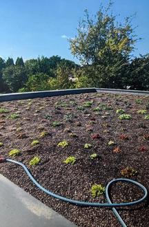Ein mit Hilfe von städtischen Fördermitteln frisch begrüntes Mayener Garagendach.