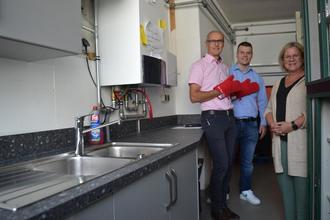 Kostenlos legte die Firma Leersch GmbH aus Mayen die neuen Leitungen und schloss alles an. Geliefert und eingebaut hat die Küche die Mayener Firma Küche 3000 Rinneburger. Werner Rinneburger: „Wir haben die Küche zum Selbstkostenpreis zur Verfügung gestellt und nichts für die Montage berechnet.“