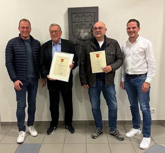 Dank und Anerkennung von Jörg Lempertz (links), Bürgermeister VG Mendig, und Thürs Ortsbürgermeister Lukas Ellerich (rechts) an Oskar Dreiser (2. v. r.) und Udo Schüller (2. v. l.).