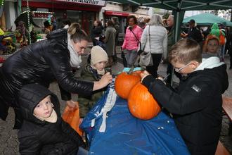 Rund um den Weiberbrunnen herrschte emsiges Treiben. Schließlich warteten knapp 350 Prachtexemplare voller Ungeduld darauf unters Messer genommen und bearbeitet zu werden. Wie man der großen Beerenfrucht mit ihrer leuchtend orangefarbenen, harten Schale ein individuelles Gruselgesicht verleiht und das Ganze mit ein bisschen Talent und Geduld perfektioniert, wussten viele der Kürbisschnitzer noch von den vorangegangen Events.