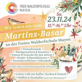In lichtvoller Atmosphäre öffnet am Samstag vor dem ersten Adventswochenende die Freie Waldorfschule Mayen ihre Türen für die Öffentlichkeit und lädt alle Familien und Interessierten zum traditionellen Martinsbasar am Samstag, den 23. November von 12.30 Uhr bis 16.30 Uhr auf das Schulgelände in der Magmastraße 1 in 56727 Mayen ein.