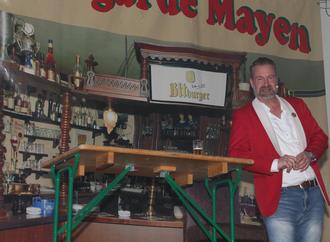Die Bühne, auf der Dank der Prinzengarde Mayen, die Theke der Mayener Schatulle, eine Kultkneipe, zu sehen war, strahlte eine reizvolle Mischung aus Nostalgie, Charme und Funktionalität aus. Alles in allem also ein Ambiente, in dem sich Volker Weininger sichtlich wohl und fast wie in seinem Vereinslokal fühlte.