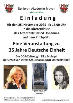 Mayen. Bei der „Seniorenakademie - Aktiv im Alter“ berichtet die DDR-Zeitzeugin Elke Schlegel am 25. November um 15 Uhr im Altenzentrum St. Johannes über ihr Schicksal.