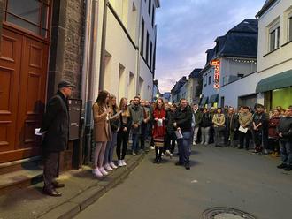 Auch 2022 gingen viele Bürgerinnen und Bürger unterschiedlichen Alters am Abend des 9. November den vom Marktplatz bis zum Mahnmal für jüdische Mitbürger*Innen in der Bürresheimer Straße verlaufenden Schweigeweg, der von Oberbürgermeister Dirk Meid moderiert wurde. An verschiedenen, eng mit dem Leben der Jüdinnen und Juden in Mayen verbundenen Orten in der Innenstadt wurde Halt gemacht.