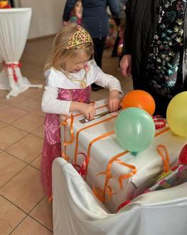 Eine kleine Kürrenberger Prinzessin gibt freudig ihren Malentwurf in die Sammelbox. Das Gewinnermotiv wird am 3. Februar 2024 beim Kinderkarneval geehrt.