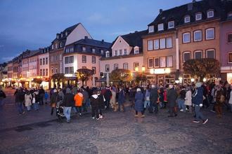 Auch in diesem Jahr gingen viele Bürgerinnen und Bürger unterschiedlichen Alters am Abend des 9. November den vom Marktplatz bis zum Mahnmal für jüdische Mitbürger*Innen in der Bürresheimer Straße verlaufenden Schweigeweg, der von Oberbürgermeister Dirk Meid moderiert wurde. An verschiedenen, eng mit dem Leben der Jüdinnen und Juden in Mayen verbundenen Orten in der Innenstadt wurde Halt gemacht.