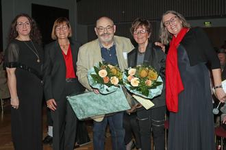 Chorleiterin Anita Reuter-Schlich, und Marlen Kröll, die zweite Vorsitzende, gratulierten den Gründungsmitgliedern Willi Nürenberg und Gretel Mintenig gemeinsam mit Dagmar Görgen, der Ersten Vorsitzende der Singgemeinschaft Georg Schlich