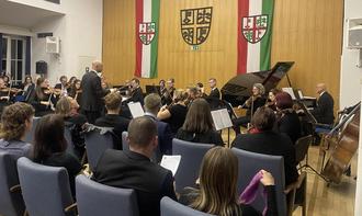 Das Städtische Orchester beim Rathauskonzert am 2. November mit Orchesterleiter David Rodriguez, sein Vorgänger Michael Fuxius am Flügel.
