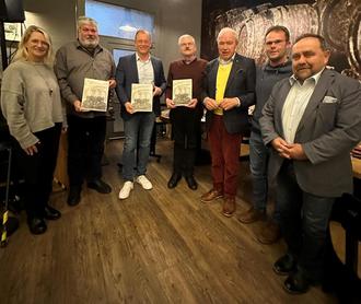 Die Brauereigeschichte ist ein Bestandteil des Mendiger Anteils am Antrag zur Anerkennung des Mühlsteinreviers RheinEifel als UNESCO-Welterbe. Das Buch „Aus einem kühlen Kellers Schacht“ von Rolf Breil (Mitte) ist sozusagen eine Klammer zur Arbeitsgemeinschaft Mühlsteinrevier RheinEifel, deren Vertreter zur Buchvorstellung durch Gernot Mittler (3. v. r.) gekommen waren (von links): Corinna Behrendt, Ortsbürgermeisterin Kottenheim, Achim Grün, Stadtbürgermeister Mendig, Jörg Lempertz, Bürgermeister VG Mendig, Alexander Weber, Ortsbürgermeister Ettringen, und Alfred Schomisch, Bürgermeister VG Vordereifel.
