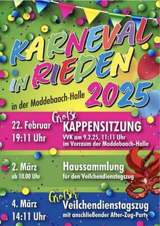 Rieden. Es ist soweit - die fünfte Jahreszeit steht vor der Tür. Für die große Kappensitzung der Karnevalsgesellschaft Rieden am Samstag, 22. Februar, findet der Kartenvorverkauf am Sonntag, 09. Februar ab 11:11 Uhr im Vorraum der Moddebaach-Halle statt. Wie in den letzten Jahren auch, besteht die Möglichkeit, sich ab 8:00 Uhr in die Liste einzutragen, nach deren Reihenfolge die Karten an die jeweiligen Personen verkauft werden.