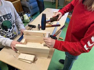 Am folgenden Tag brachten sie ihre Baustoffe mit. Hammer, Nägel, Sägen und Schmirgelpapier wurden gemeinsam aus dem Werkraum geholt und in die Klasse getragen, wo eine Werkbank bereitstand. Mit viel Konzentration, gegenseitiger Hilfe und Freude am Tun entstanden individuelle Bauwerke.