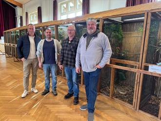 Jörg Lempertz (links), Bürgermeister VG Mendig, und Achim Grün (rechts), Stadtbürgermeister Mendig, gratulierten Kevin Bräuer (2. v. l.), Vorsitzender Kanarienzucht- und Vogelschutzverein Mendig, und seinem langjährigen Vorgänger Rainer Mayer, zum 50-jährigen Bestehen des Vereins.
