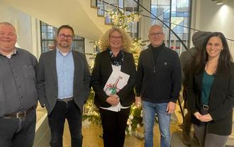 V.l.n.r.: Personalratsvorsitzender Wolfgang Goeken, Fachbereichsleiter Peter Brück, Gabriele Schmitz, Oberbürgermeister Dirk Meid und Büroleiterin Jasmin Alter