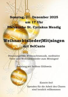 Zur Einstimmung auf das bevorstehende Weihnachtsfest lädt das Mendiger Vokalensemble „BelCanto“ alle Freunde der Chormusik am 4. Adventsonntag um 17:00 Uhr zu einer besinnlichen Stunde in die St. Cyriakus-Kirche in Niedermendig ein.