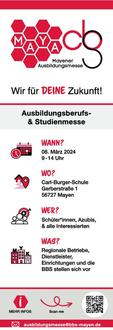 Mit MAYA - der zweiten Mayener Ausbildungs-, Berufs- und Studienmesse an der Berufsbildenden Schule Mayen - erhalten junge Menschen am Freitag, 08. März 2024 von 9.00 bis 14.00 Uhr die perfekte Gelegenheit, sich über die zahlreichen Perspektiven in der Aus- und Weiterbildung sowie über Studienangebote zu informieren.