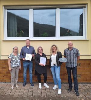 v.l.: Gastgeber Margit Sauermann, Tanja & Christian Schott, Petra Wuitschick (Rhein-Mosel-Eifel Touristik), Elmar Leyendecker (2. Beigeordneter der Ortsgemeinde Löf-Kattenes)