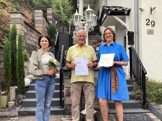 Übergabe: (Von links nach rechts) Franziska Bast (Tourist-Info Sonnige Untermosel), Dieter Berenz, Bürgermeisterin Kathrin Laymann Copyright