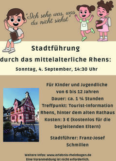 Am 04. September bietet der Stadtführer Herr Schmillen um 14:30 Uhr eine Stadtführung durch das mittelalterliche Rhens an. Unter dem Thema „Ich sehe was, was du nicht siehst“ gilt es, Such-Aufgaben, Schätz-Fragen und Rate-Spiele zu lösen, um so auf kindgerechte Art und Weise typisch Mittelalterliches in der über 600 Jahre alten Stadt Rhens zu entdecken.