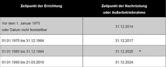 Tabelle 1: Fristen zur Nachrüstung oder Außerbetriebnahme von Einzelraumfeuerungsanlage: