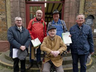 Kürzlich startete die letzte von zehn Etappen des Schoppenstecherwegs, der von Moselweiß nach Treis und dann von Karden nach Güls führt. Der Vorsitzende der Bezirksgruppe Mayen-Koblenz des Eifelvereins, Landrat Dr. Alexander Saftig, verlieh Walter Schoor und Gerd Trein, die das Projekt Schoppenstecherweg organisiert hatten, die Grüne Verdienstnadel des Eifelvereins.