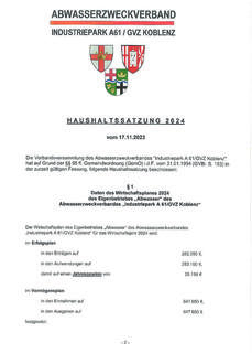 Die Haushaltssatzung und der Wirtschaftsplan des Eigenbetriebes „Abwasser“ des Abwasserzweckverbandes „Industriepark A 61/GVZ Koblenz“ für das Haushaltsjahr 2024 liegen gemäß § 97 Abs. 2 GemO in der Zeit von Mittwoch, den 10.01.2024, bis Mittwoch, den 17.01.2024 (einschließlich), während der Öffnungszeiten