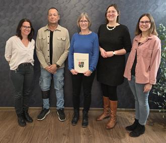v.l.n.r. Fachbereichsleiterin Bürgerdienste Jennifer Naunheim, Büroleiter Rüdiger Beckendorf, Sigrid Sisterhenn, Bürgermeisterin Kathrin Laymann, Personalratsmitglied Sophie Sehner