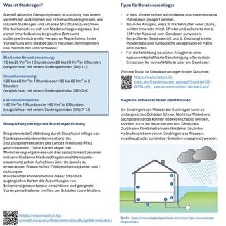 Die zurückliegenden Monate haben gezeigt, dass anhaltender Starkregen zu Überflutungen führen und immense Schäden anrichten kann. Starke Regenfälle und damit verbundene Überflutungen können überall auftreten - unabhängig von der Entfernung zum nächsten Gewässer. Deshalb ist die Eigenvorsorge zur Schadensminderung unverzichtbar.