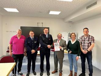v.l.n.r: Guido Kohl (2. stellv. Wehrleiter VG Vallendar), Thorsten Glaab (Wehrführer), Sebastian Strauß (stellv. Wehrführer), Adolf T. Schneider (Bürgermeister), Karin Küsel (Ortsbürgermeisterin), Florian Neuroth (Leiter Ordnungsamt).