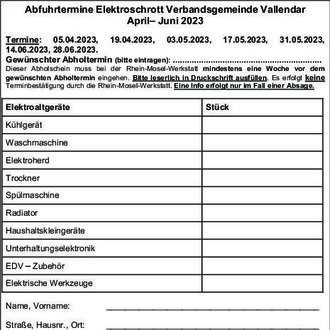 Die Bürgerinnen und Bürger aus der Verbandsgemeinde Vallendar können wieder Elektrogeräte durch die Rhein-Mosel-Werkstatt gGmbH Koblenz in Weißenthurm kostenpflichtig abholen lassen. Die Kosten betragen pro Anfahrt 10,00 € und pro Großgerät 3,00 €. Die Einsammlung von Elektrogeräten erfolgt zu festgelegten Terminen, immer im Laufe des Vormittags. Der Abholtag ist Mittwoch. Bitte senden Sie den Abholschein per Post oder per Mail an die folgende Anschrift: