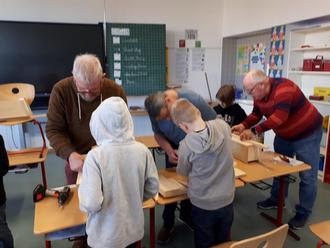 In der Grundschule konnten die Schüler/innen die Arbeitsgemeinschaft „Bau von Nistkästen wählen. Ein erfahrener Ornithologe hatte Nistkasten-Bausätze beim BUND organisiert. Und die gewünschte Begeisterung hat sich von der ersten Minute an bei den 25 Kindern der AG eingestellt. Unterstützt von Helfern der W.I.S.O. haben die Kinder mit sehr viel Eifer je einen „eigenen“ Nistkasten gefertigt und in der Streuobstwiese an geeigneten Bäumen befestigt. Die zahlreichen W.I.S.O.-Helfer konnten neugierige Kinder mit strahlenden Augen erleben. Diese Neugier für die eigene Umwelt soll weiter gefördert werden. Was passiert in und an den „eigenen“, namentlich markierten, Nistkästen im Laufe eines Jahres? Werde ich da gebraucht? Was gibt es sonst auf den Streuobstwiesen zu beobachten und zu untersuchen? Eine Streuobstwiesen-AG könnte im nächsten Schuljahr ausführliche Antworten auf die Fragen geben, wenn die Kooperation zwischen Schule und W.I.S.O. weiterhin so gut funktioniert.