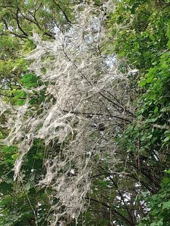 Gespinstmotten befallen verschiedene Laubgehölze (Sträucher und Bäume), sind aber für den Menschen ungefährlich. Das Bild zeigt einen Befall in der Ortsgemeinde Urbar.