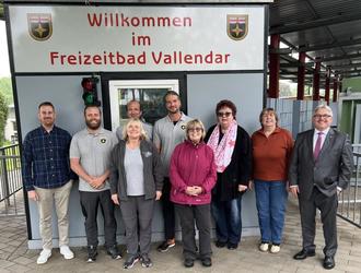 Von links: Till Müller (Fachbereich 2), das Team Freizeitbad (Kevin Joost, Brigitte Günther, Harald Baumann, Sebastian Buß, Ursula Schwab, Claudia Schaaf und Monika Zabel) und Adolf T. Schneider (Bürgermeister der Verbandsgemeinde Vallendar)
