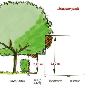 | Beachten Sie auch das sog. „Lichtraumprofil“, das von allen Grundstückseigentümern einzuhalten ist, deren Grundstücke an öffentliche Straßen sowie Geh- und Radwege angrenzen: Der Pflanzenwuchs darf bis zu einer Höhe von 2,50 Metern nicht über den Gehweg ragen. |