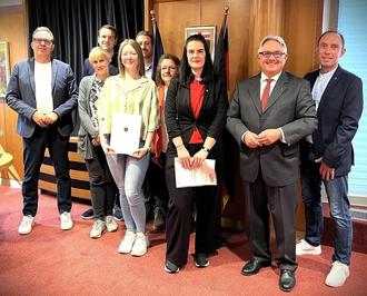 Büroleiter Peter Rosenbaum (links) und Bürgermeister Adolf T. Schneider (2.v.r.) mit Mitarbeiterinnen und Mitarbeitern sowie Vertretungen aus Interessenvertretung und Fachbereichsleitung anlässlich aktueller Personalveränderungen.