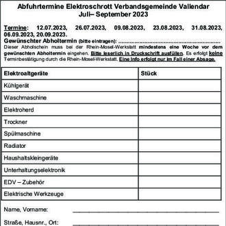 Die Bürgerinnen und Bürger aus der Verbandsgemeinde Vallendar können wieder Elektrogeräte durch die Rhein-Mosel-Werkstatt gGmbH Koblenz in Weißenthurm kostenpflichtig abholen lassen. Die Kosten betragen pro Anfahrt 10,00 € und pro Großgerät 3,00 €. Die Einsammlung von Elektrogeräten erfolgt zu festgelegten Terminen, immer im Laufe des Vormittags. Der Abholtag ist Mittwoch. Bitte senden Sie den Abholschein per Post oder per Mail an die folgende Anschrift: