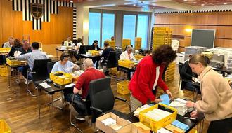 Aufgrund der Stichwahlen in der Verbandsgemeinde Vallendar (Landratswahl im Landkreis Mayen-Koblenz und Stichwahl zum Ortsbürgermeister der Ortsgemeinde Urbar) wurde unmittelbar nach Eintreffen der Wahlscheine, Erläuterungen und entsprechenden Umschläge kurzerhand der Sitzungssaal im Rathaus zu einer Packstation umfunktioniert.