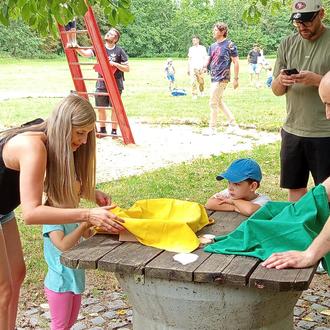 Die Kinder freuen sich immer ganz besonders, wenn die Papas mit ihnen ganz allein spielen und so wurde auf die Torwand geschossen, Schubkarrenrennen und Sackhüpfen gespielt. Es wurden Naturbilder gestaltet, ein Quiz erraten und Naturmaterialien erfühlt. Natürlich war auch an das leibliche Wohl gedacht, als gesunde Kita gab es Laugenstangen und Rohkost.