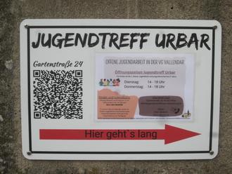 Es weist unseren Jugendlichen den Weg zum Jugendtreff Urbar, der sich unterhalb der Kirche befindet, und gibt die Öffnungszeiten an.