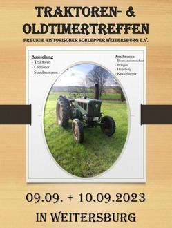 Endlich wieder Oldtimer Schleppertreffen in Weitersburg. Wir, die Freunde Historischer Schlepper Weitersburg laden sie alle zum großen Oldtimer Schlepper Treffen vom 09.09.23 bis 10.09.23 in Weitersburg ein. Es wird wieder viel zu sehen sein! Oldtimer Traktorenausstellung, alte Landmaschinen,Standmotoren, Baumstammziehen, Oldtimer Pflügen usw. Für das leibliche Wohl an allen Tagen ist gesorgt. (Anreise ist ab Freitag den 08.09.23 möglich). Wir freuen uns auf ein tolles Oldtimertreffen und hoffen viele Gäste aus Nah und Fern begrüßen zu können.