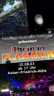 Der Förderverein der freiwilligen Feuerwehr Vallendar lädt euch in diesem Jahr wieder ein, „Rhein in Flammen“ zu feiern. Am vielleicht schönsten Blick über das mittlere Rheintal wollen wir in diesem Jahr mit euch den Ausblick genießen, leckeren Wein und Bier trinken und gemeinsam den Abend genießen.
