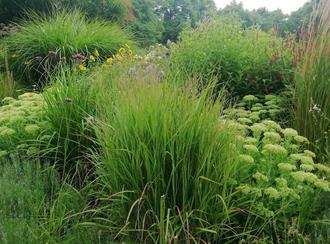 Hohe Fetthenne- (Sedum), Mannstreu- (Eryngium), Eisenkraut- (Verbena) oder Knöterich-Arten (Polygonum), hier kombiniert mit verschiedenen Gräsern, sind trockenheitsverträgliche, robuste Staudenarten, die sehr gut an vollsonnigen Standorten im Hausgarten verwendet werden können. Mit ihren Blütenständen erfreuen sie Insekten und Gartenbesitzer