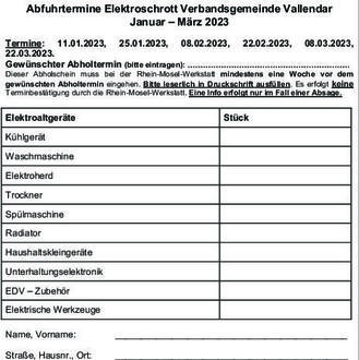 Die Bürgerinnen und Bürger aus der Verbandsgemeinde Vallendar können wieder Elektrogeräte durch die Rhein-Mosel-Werkstatt gGmbH Koblenz in Weißenthurm kostenpflichtig abholen lassen. Die Kosten betragen pro Anfahrt 10,00 € und pro Großgerät 3,00 €. Die Einsammlung von Elektrogeräten erfolgt zu festgelegten Terminen, immer im Laufe des Vormittags. Der Abholtag ist Mittwoch. Bitte senden Sie den Abholschein per Post oder per Mail an die folgende Anschrift: