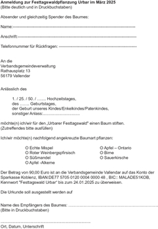 Wir bitten Sie, sich bei Interesse bis zum 01.02.2025 bei der Verbandsgemeinde mit beigefügtem Formular anzumelden. Um möglichst vielen Bürgerinnen und Bürger die Möglichkeit zu geben sich an der Aktion zu beteiligen und sich einzubringen, ist die Baumspende auf einen Baum je Familie beschränkt. Insgesamt besteht die Möglichkeit 12 Bäume zu pflanzen..