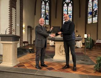 Im Rahmen einer Eucharistiefeier hat der Vorsitzende des Fördervereins Gisbert Wüst jüngst dem Organisten der Pfarrkirche Roland Dinspel ein Orgelbuch besonderer Art übergeben, nachdem dies mit Unterstützung des Fördervereins restauriert und neu gefasst wurde.