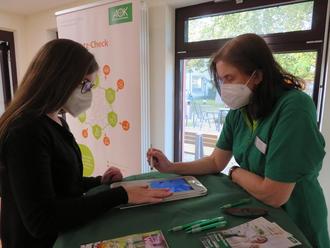 Im INFO-Treff bot die AOK einen Zellschutz-Check mit Biozoom an. Bei der Messung wird der Carotin-Gehalt in Haut und Blut bestimmt. Interessierte erfuhren, wie gut ihre Körperzellen aktuell durch Antioxidantien geschützt sind, und erhielten im Anschluss eine kurze Ernährungsberatung. Um die Versorgung mit Antioxidantien direkt vor Ort anzuregen, hatte Diätassistentin Silvia Riitamaa ebenso gesunde wie leckere Gemüsewaffeln und Getränke vorbereitet.