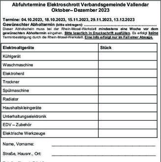 Die Bürgerinnen und Bürger aus der Verbandsgemeinde Vallendar können wieder Elektrogeräte durch die Rhein-Mosel-Werkstatt gGmbH Koblenz in Weißenthurm kostenpflichtig abholen lassen. Die Kosten betragen pro Anfahrt 10,00 € und pro Großgerät 3,00 €. Die Einsammlung von Elektrogeräten erfolgt zu festgelegten Terminen, immer im Laufe des Vormittags. Der Abholtag ist Mittwoch. Bitte senden Sie den Abholschein per Post oder per Mail an die folgende Anschrift: