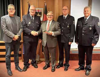 v.l.: Büroleiter Rosenbaum, Wehrleiter Schemmer, Bürgermeister Schneider sowie die stellvertretenden Wehrleiter Klöckner und Kohl