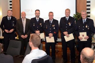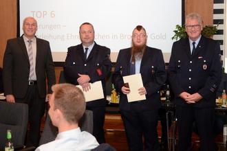 Das goldene Ehrenabzeichen für 35 Jahre aktive Feuerwehrdienste an die Kameraden: LZ Niederwerth: Oberfeuerwehrmann Stefan Klöckner, Hauptfeuerwehrmann Markus Stein, Hauptfeuerwehrmann Rolf Jächel, Oberbrandmeister Dieter Stein, Hauptbrandmeister Frank Schemmer; LZ Urbar: Brandmeister Jörg Nebenführ, Brandmeister Jörg Gräf