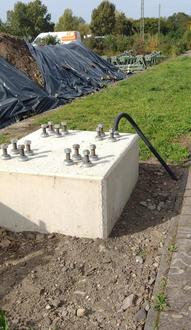 Die Bauarbeiten zur neuen Kreisstraße nach Niederwerth haben begonnen: die Bahn hat bereits neue Fundamente für ihre Strommasten gesetzt.